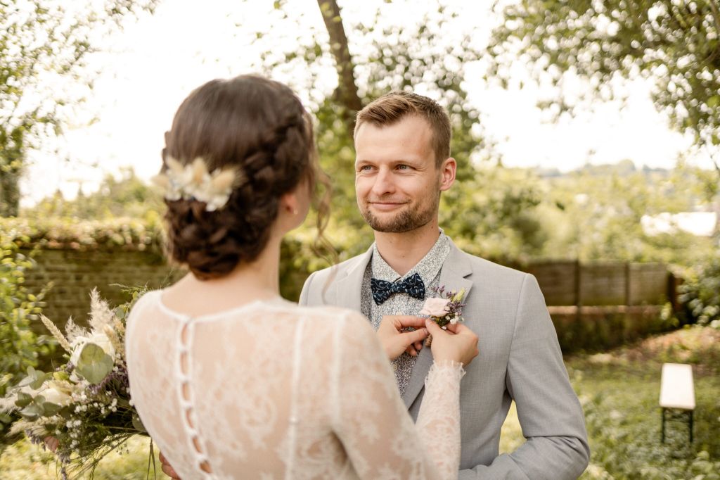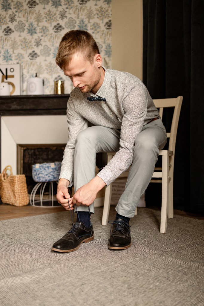 Pendant ce temps Camille est arrivée dans la maison de famille où se déroulerait la cérémonie laïque. Elle a soigneusement pris de très belles photos de la maison et des détails de nos tenues (bijoux, parfum, noeud papillon…). L’habillage de Rémi, entouré de ses parents, son frère et sa sœur a ensuite commencé.